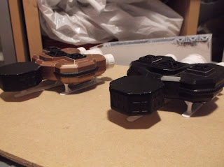 I'm happy enough so far. They seem to fit into the Blake's 7 look quite nicely. They're almost finished, but I think I might add some sort of cockpit type bulge at the top of the nose to give the crew somewhere plausible to sit if I can find the right bit.